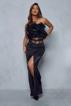 Lexi Wood Satin Lace Detail Dip Waist Split Midi Skirt